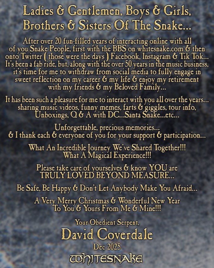 DAVID COVERDALE SAYS THAT AFTER TWO DECADES, HE WILL BE SLITHERING AWAY FROM SOCIAL MEDIA