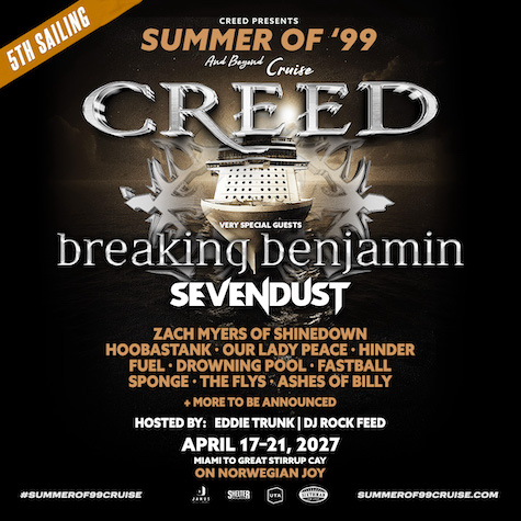 Creed, in partnership with Sixthman, the leader in festivals and music cruises for more than two decades, has announced the fifth sailing of their blockbuster rock celebration at sea, Summer of ’99 & Beyond Cruise, traveling April 17th-21st, 2027, from Miami, FL to Great Stirrup Cay, Bahamas on the spectacular Norwegian Joy. Alumni pre-sales will be held April 30th-May 1st, and May 4th-5th; First Round Presale Signups are available now through May 4th at 11:59 pm (ET). Final Round Presale Signups will conclude May 11th at 11:59 pm (ET). Public On-Sales begin May 13 at 2:00 pm (ET), exclusively at summerof99cruise.com. Savings of $100 are available during the presale; prices will increase on May 13th at 2:00 pm (ET). The first 850 cabins booked receive their choice of the following: an exclusive 30-minute Creed acoustic set; a photo with Creed; or a 30-minute Q&A with Breaking Benjamin (subject to availability).